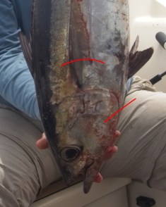A couple important things need to happen now fairly quickly. Many fish will benefit greatly from bleeding. Getting the blood out of the body removes the lactic acid that has built up during the fight. The body temperature of some fish (especially tuna) can rise dramatically during the fight, and draining the blood helps cool off the meat. For some fish, leaving the blood in the meat produces an “off” taste, or even one of ammonia. Not every kind fish needs bleeding, but it will never hurt, so just do it. You want to start the bleed before the heart stops pumping, so don’t wait.